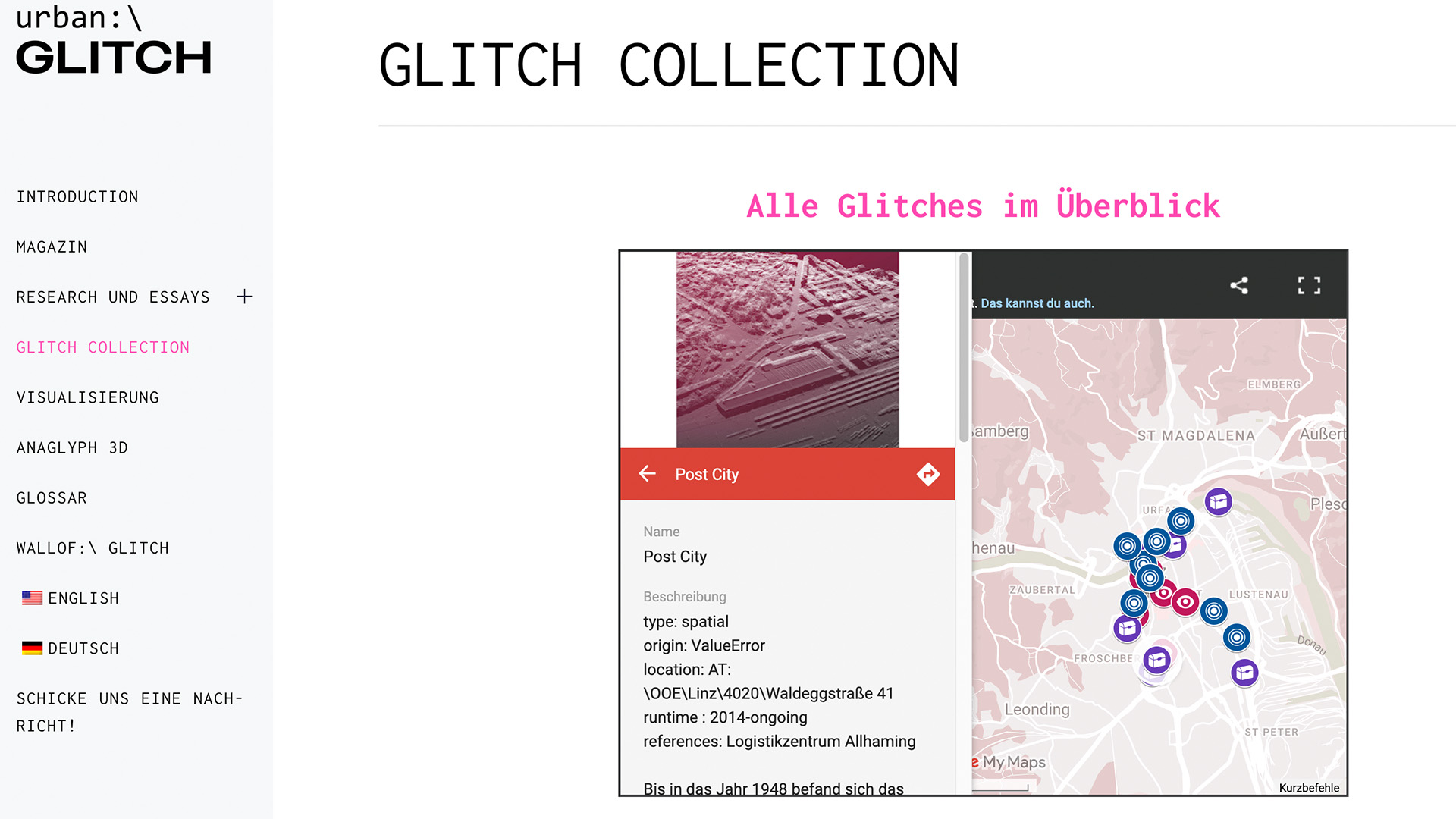Der Begriff Urban Glitches wurde entwickelt, um die analogen Konsequenzen urbanistischer Programmierungsfehler zu beschreiben und Möglichkeiten für konkrete Bug-Fixes oder Updates auf einer abstrakten Ebene zu erkunden. Im Rahmen der Arbeit erschienen ein gedrucktes Magazin in Kleinauflage und eine Homepage. Das Projekt wurde  auf der Ars Electronica 23 präsentiert.
